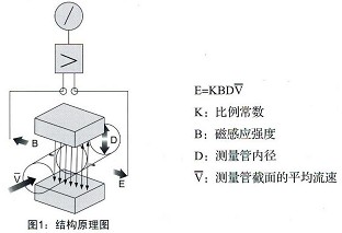電磁流量計測量原理是基于法拉第電磁感應定律。流量計的測量管是一內襯絕緣材料的非導磁合金短管。兩只電極沿管徑方向穿通管壁固定在測量管上。其電極頭與襯里內表面基本齊平。勵磁線圈由雙向方波脈沖勵磁時,將在與測量管軸線垂直的方向上產生一磁通量密度為B的工作磁場。此時,如果具有一定電導率的流體流經測量管,將切割磁力線感應出電動勢E。電動勢E正比于磁通量密度B、測量管內徑d與平均流速V的乘積,電動勢E(流量信號)由電極檢出并通過電纜送至轉換器。轉換器將流量信號放大處理后,可顯示流體流量,并能輸出脈沖,摸擬電流等信號,用于流量的控制和調節。