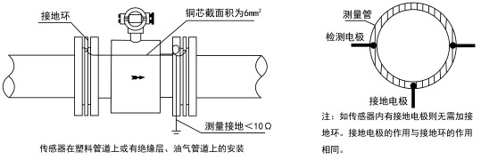 b、在塑料管道上或有絕緣層、油漆管道上的接地方式:傳感器上的兩端面應加裝接地環或內置接地電極,使管內流動的被測介質與大地短接,具有零電位。否則電磁流量計無法正常工作。