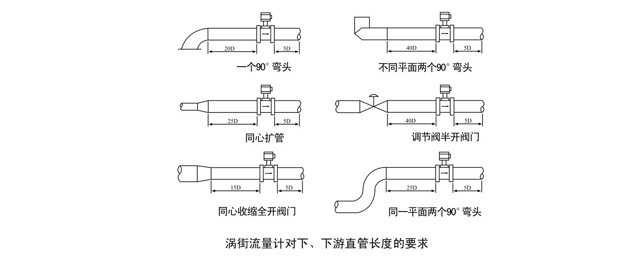 4、渦街流量儀表對安裝點的上、下游直管段有一定要求,否則會影響介質在管道中的流場,影響儀表的測量精度。儀表的上下游直管段長度要求見下圖: