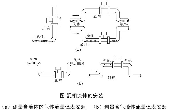 9、測量氣體時,在垂直管道安裝儀表,氣體流向不限。但若管道內含少量液體,為了防止液體進入儀表測量管,氣流應自下而上流動,如下圖a所示