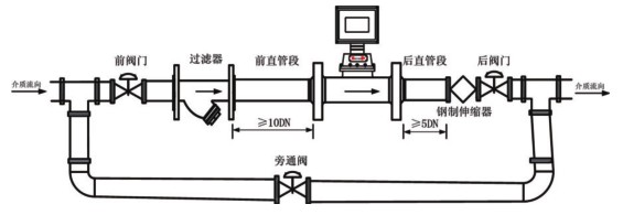 5、流量計(jì)應(yīng)水平安裝。建議在流量計(jì)后直管段后側(cè)安裝鋼制伸縮器(補(bǔ)償器),伸縮器必須符合管道設(shè)計(jì)的公稱通徑和公稱壓力的要求。伸縮器是作為管道應(yīng)力的補(bǔ)償及方便流量計(jì)的安裝與拆卸。