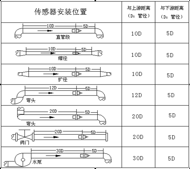 一個理想測量管段的定義是:管道中的液體必須是滿管而且要有足夠的直管段長度。管道可以是水平的或者垂直的。下圖示例為如何正確定位。