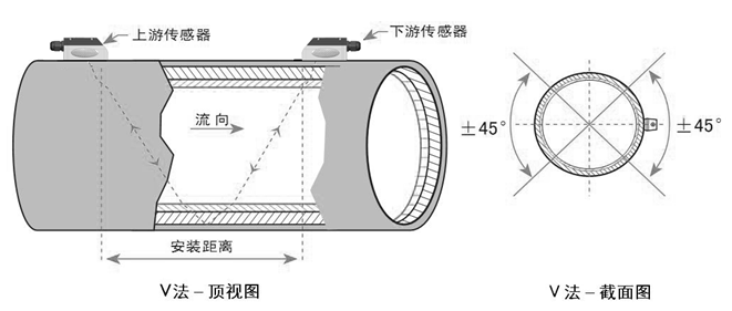 V方式安裝傳感器是在常用的方法,一般建議在15-400mm的管道上使用,它有時被稱為反射法。