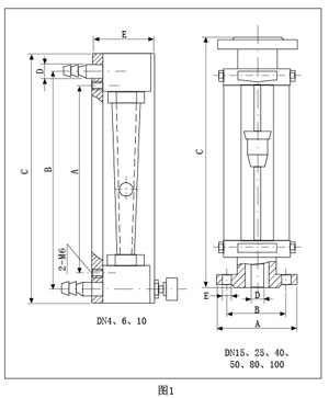 ZH-LZB/LZB-( )F流量計的錐管為光滑內(nèi)壁管(見圖4),通徑DN15以上的流量計,浮子通過導(dǎo)桿 上下移動,保持穩(wěn)定;ZH-LZJ/LZJ-( )F流量計錐管 內(nèi)壁有三條導(dǎo)向凸筋,使浮子保持穩(wěn)定(見圖4)。通徑DN10以下的流量計采用軟管連接,配有針形流量調(diào)節(jié)閥;通徑DN15以上流量計采用法蘭連接。