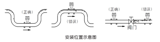 一是被測(cè)量的管道內(nèi)必須完全充滿液體。重要的是,在任何時(shí)候,保持管道內(nèi)完全充滿液體,否則流量顯示會(huì)受到影響,可能會(huì)導(dǎo)致測(cè)量誤差。具體安裝如下圖所示:
