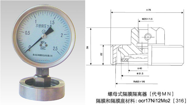 9、MN螺母式衛(wèi)生型隔膜壓力表:量程上限0.4~2.5MPa