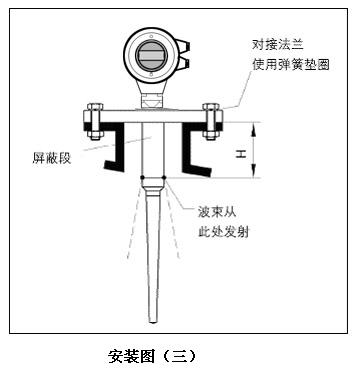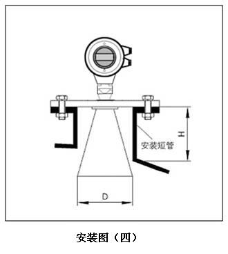2.如果喇叭直徑大于安裝短管的直徑,包括延伸管在內(nèi)的天線需要從容器里面安裝,并將儀表抬高。選擇延伸管使儀表至少抬高100mm。